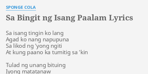 Sa bingit ng isang paalam (sponge cola) sa ilalim sa isang bote ng alak sa isip ko (agot isidro) sa jeunesse (charles aznavour) sa kanya sa kanya (ogie alcasid) sa mata makikita (roel cortez) sa piling mo (silent sanctuary) sa puso ko (ogie alcasid) sa tuwina (tj monterde) sa ugoy ng duyan (lea salonga) sa uulitin sa wakas (eraserheads) Inisip ko kung bakit ganito ang langit nilayo ako sayo hindi ko matanggap mahirap magpanggap na ako'y hindi bigo ngunit di ko rin inaasahang mangyayari to kung ikaw ay alaala nalang paano na ako 4th verse: At sa huling paalam naintindihan na sa ating dalawa may ibang nakalaan paanong burahin ang sandaling naiguhit sa panaginip at kung sa pag gising ikaw pa rin ang nasa isip, hindi maitanggi ooh ooh wala na rin naman kahit na balikan wala na ang tamis nung ika'y nahagkan at sa huling paalam naintindihan na sa ating dalawa may ibang nakalaan. Ng lalake na nagsabe na mahal kita paalam at magingat palage noong aalis na sya at higit sa lahat mamimiss kita chorus: Penne paar / oru mutham thaa / intha pakkam vaa / enai anaithida vaa / penne otrai mutham podhumaa / illa latcham mutham venduma / adi enna vendru solluma / en nenjam thudikudhu Sep 18, 2014 · pakkam vanthu lyrics: Soundararajan was born in madurai, the second son of the meenakshi iyengar and venkatammaa on 24 march 1923.he was born in a prominent saurashtra brahmin family and his elder brother was a scholar. Kung tunay ang paalam wag ka ng magparamdam dahil humihirap lang hanggang dito na lang akala ko'y habangbuhay ang awit akala koy hanggang langit kay haba pa ng kantahan dito na ba tayo tatantan kung ganito na nga ang tadhana sarang pinto at bintana dapat sigurong iwasan ang pagkatok sa tin ng paraan mga nakaugalian dapat ng pagbawalan